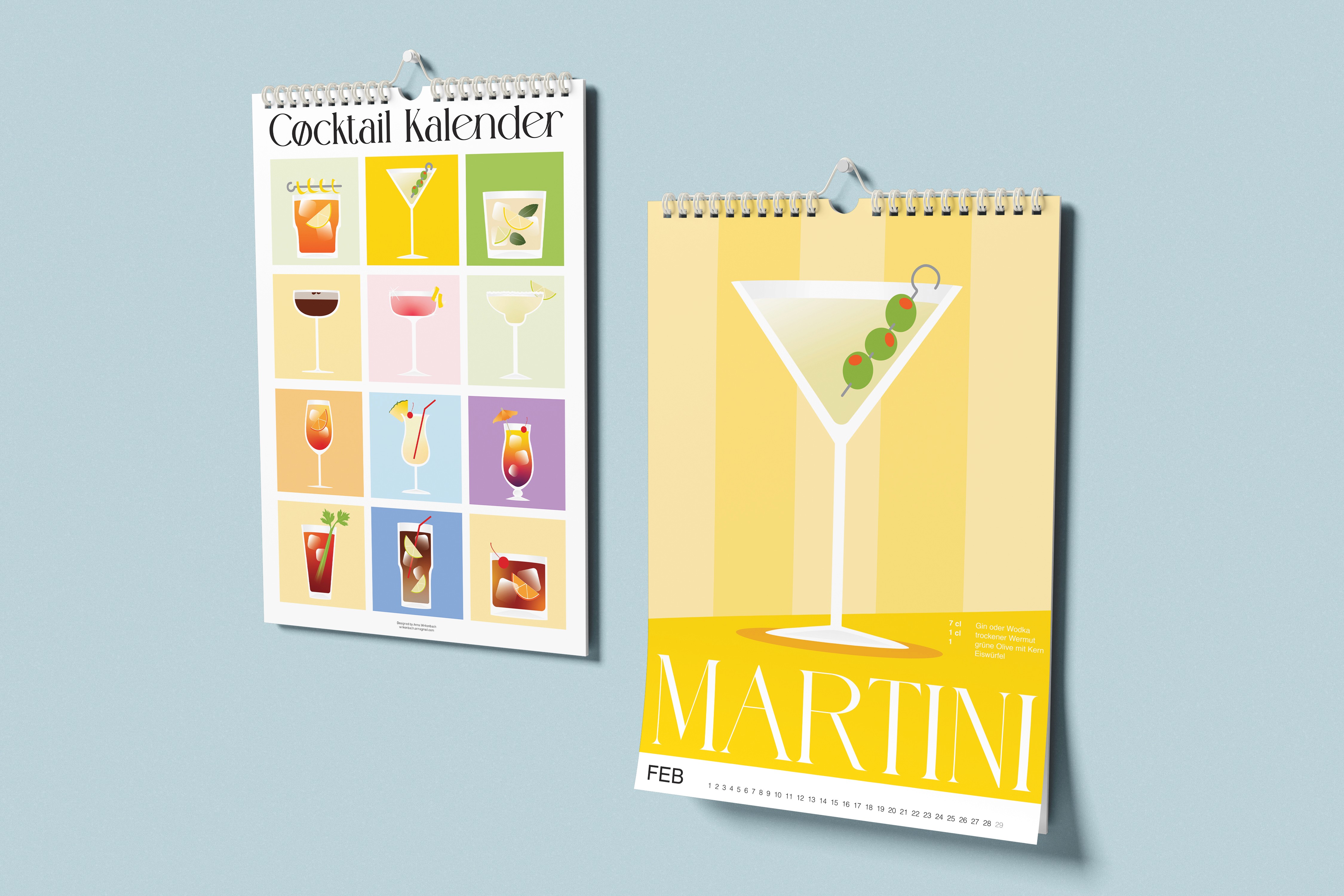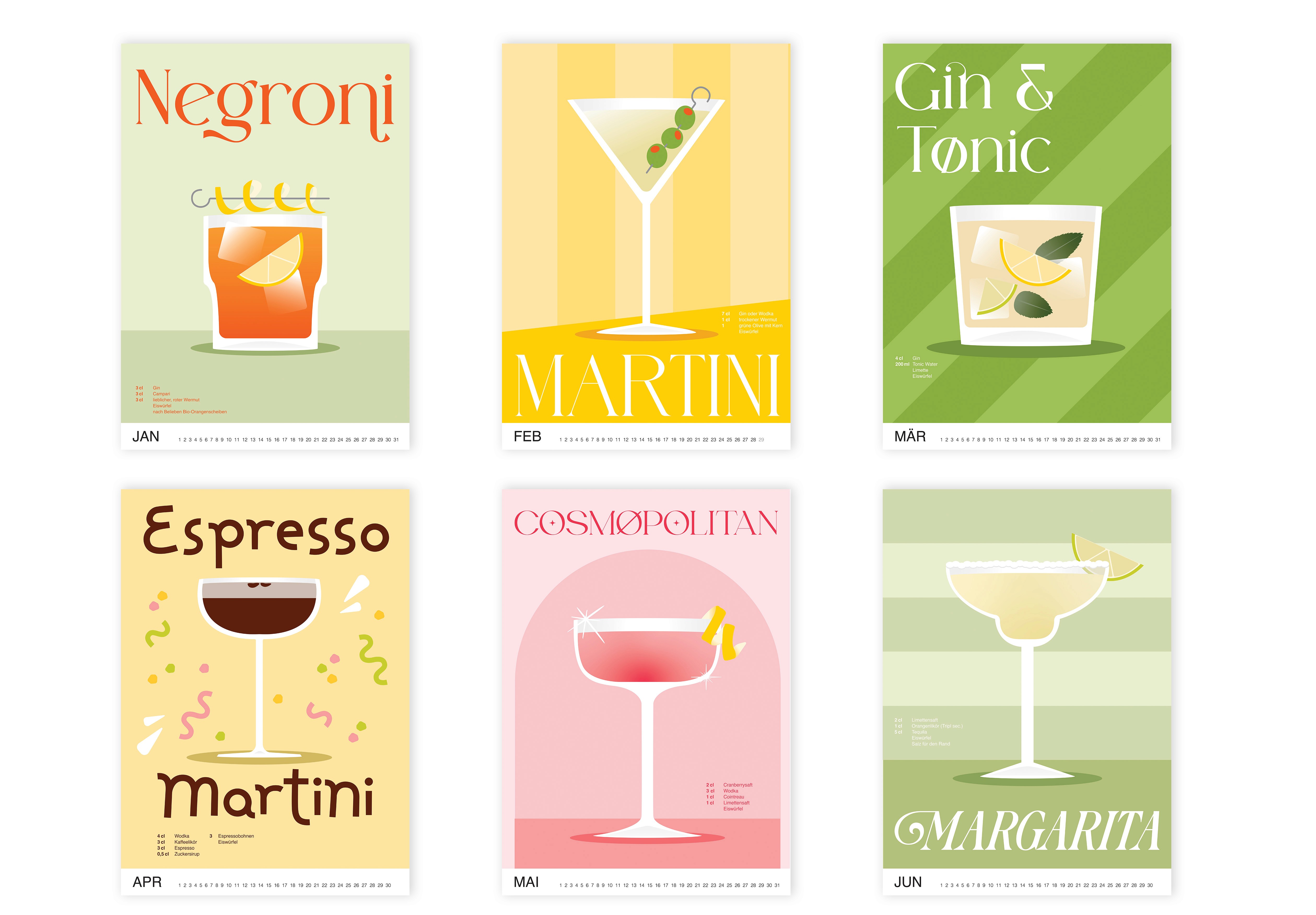 Dieses Projekt ist ein universeller Kalender, bei dem ausschließlich die Tageszahlen dargestellt sind – unabhängig von Wochentagen oder Jahren. Jeder Monat wird von einer individuell gestalteten Cocktail-Illustration begleitet, ergänzt durch das passende Rezept. Die ausgewählten Cocktails sind thematisch auf die Saison und Stimmung des jeweiligen Monats abgestimmt und machen den Kalender zu einem dekorativen wie inspirierenden Begleiter durchs Jahr.