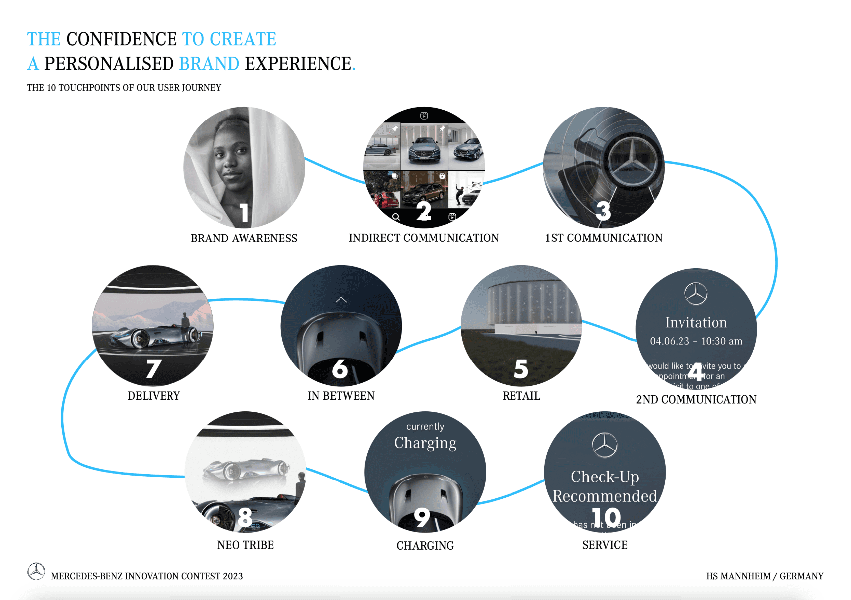 Im Rahmen des Wettbewerbs entwickelten wir ein Innovationskonzept für Mercedes-Benz zur Leitfrage: „Wie sieht das Kundenerlebnis im stationären Handel im Jahr 2053 aus?“ Die Teams standen in direktem Austausch mit der Mercedes-Benz AG in Stuttgart und präsentierten ihre Ideen vor Expert:innen des Unternehmens.