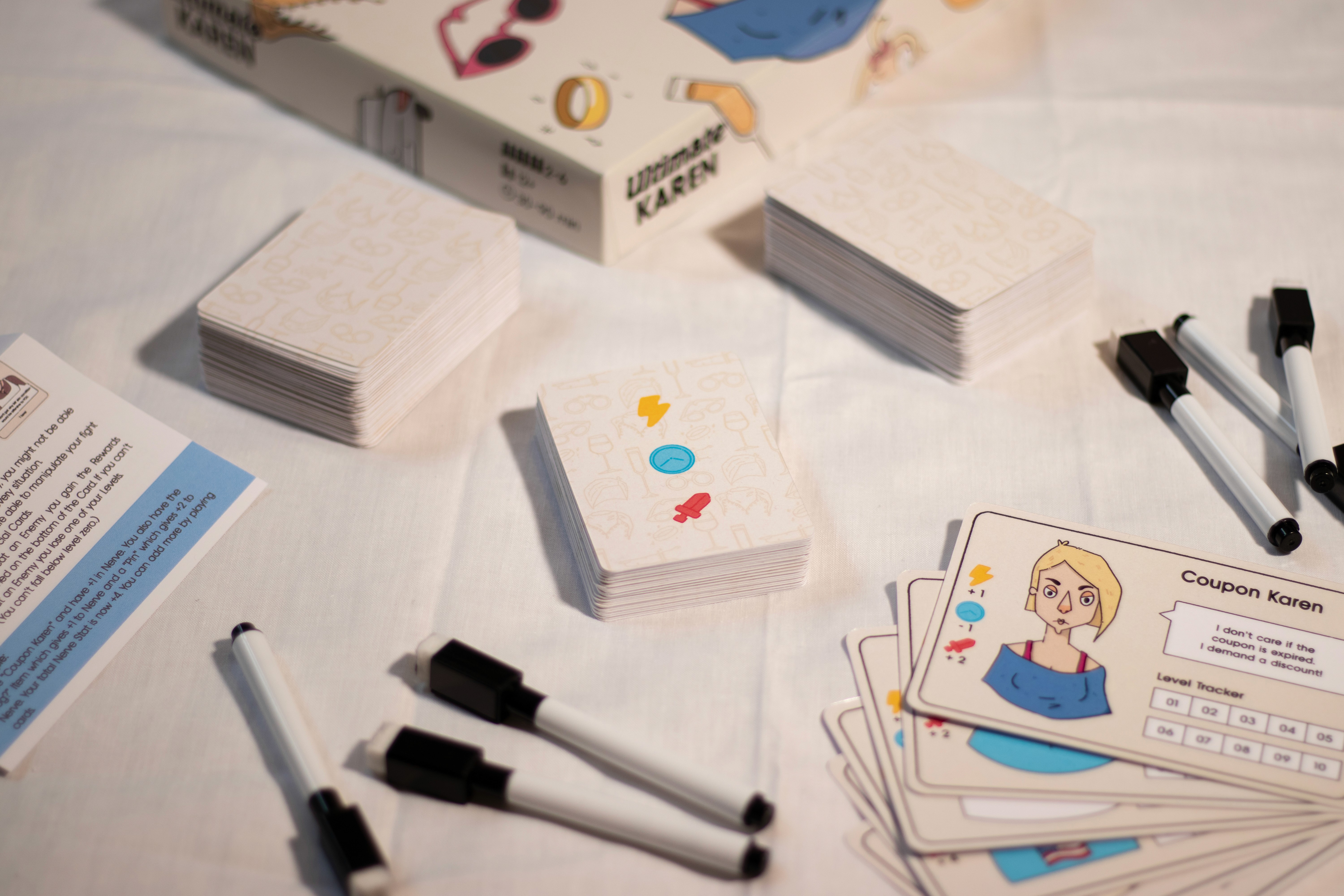 Anschließend entwickelte ich die Spielmechanik und die inhaltliche Struktur. Das Spiel basiert auf humorvollen und provokanten Karten, die typische Karen-Verhaltensweisen und gesellschaftliche Probleme thematisieren. Für das Design wählte ich einen minimalistischen, modernen Stil: Die Illustrationen spiegeln klischeehafte Merkmale der „Karen“-Figur wider und wirken gleichzeitig humorvoll und kritisch.